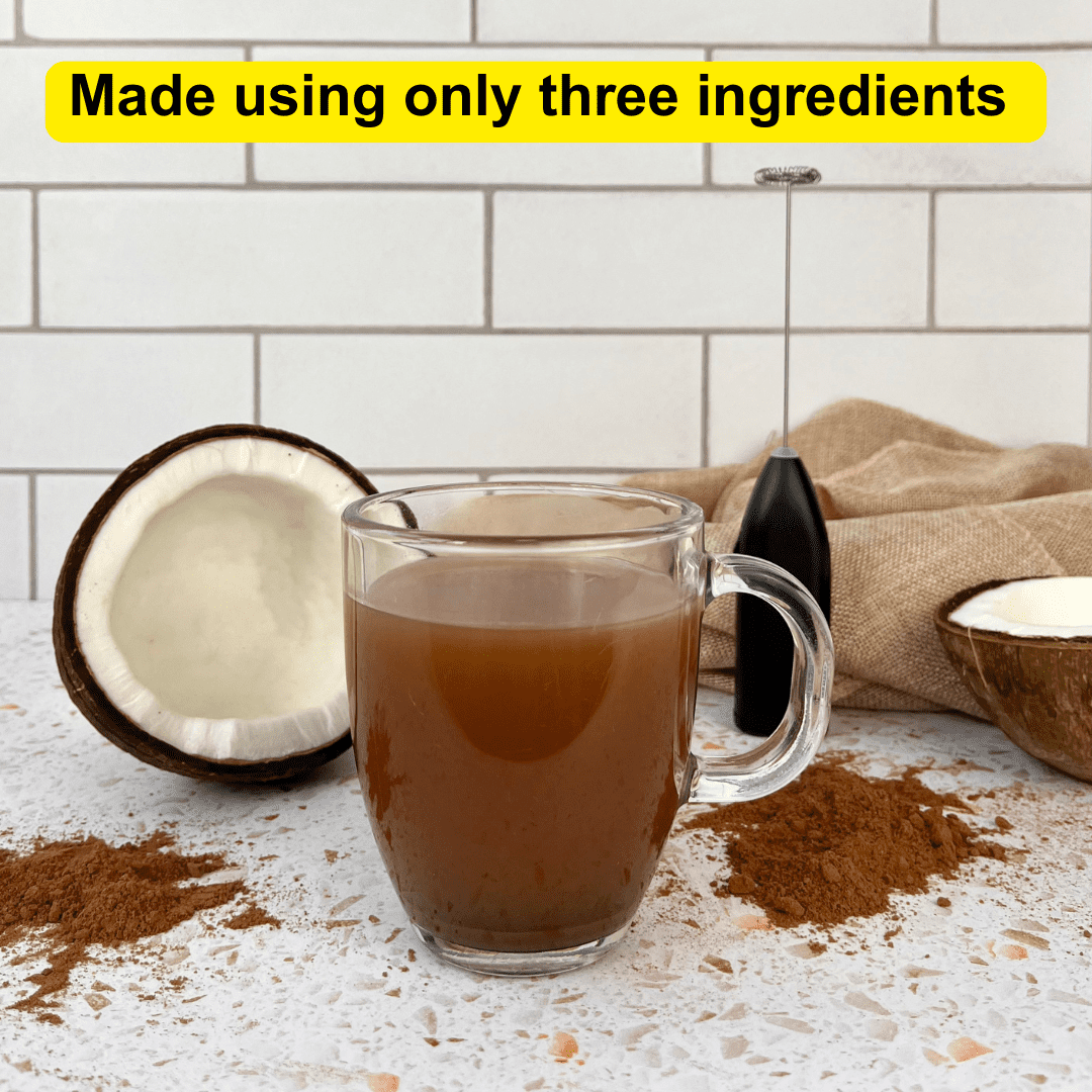 Organic cacao, packed with antioxidants, infuses each cup with a rich, deep chocolate flavour and mood-enhancing benefits 🍫. Organic coconut milk powder adds a light sweetness and lush creaminess, boosting metabolism with every sip 🥥. Bone broth, rich in collagen, supports joint and digestive health, providing a foundation of strength and vitality with each indulgent sip 🍲.