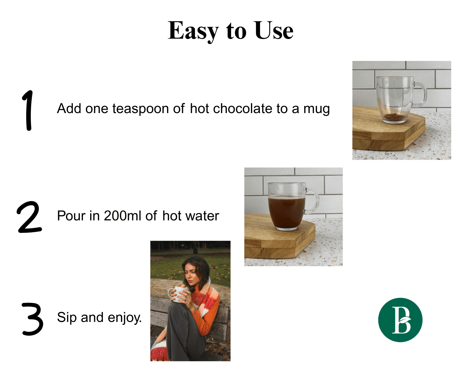 Together, these premium ingredients create a sumptuous hot chocolate that not only delights the senses but also promotes overall well-being ✨.