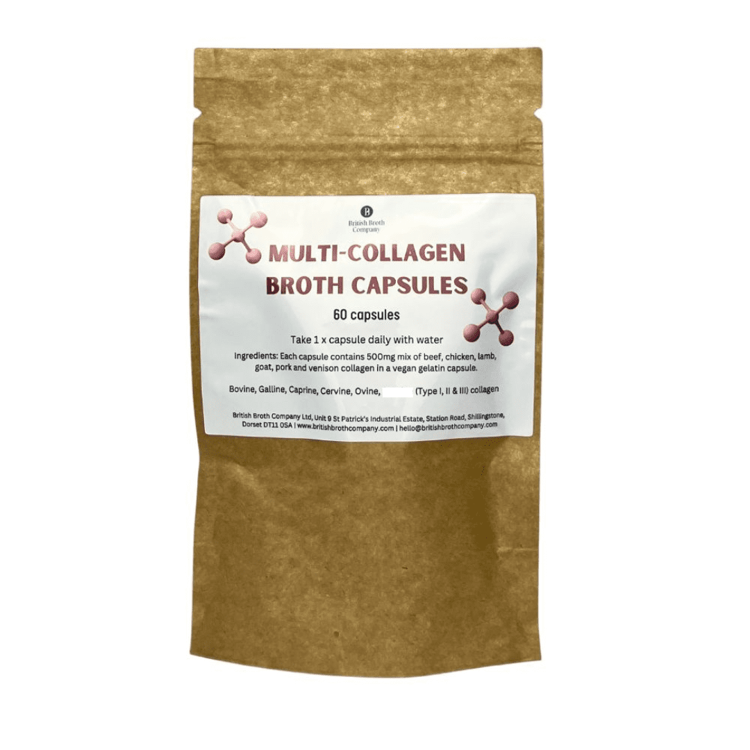 Ingredients: Beef, Lamb, Chicken, Goat & Venison bone broth dehydrated in a vegan gelatin capsule (not hydrolysed).